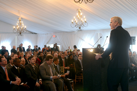 Regardless, spirits were generally high among all in attendance. The plan is for the casino to open in late 2012, and cash-strapped City and County officials up in the front rows were clearly salivating at the prospect of an additional $21.2 million (City), $12.2 million (County) and $14.1 million (Hamilton County school districts) annually in gaming tax revenues. Indeed, Hamilton County Commission President Greg Hartmann noted that “You can’t cut your way to prosperity…you have to work on economic development as well.” With a statement like that, it sounds to me like Commissioner Hartmann clearly should be a vocal proponent of the proposed streetcar system, given that it is a proven tool for economic development, expanding the city’s tax base and increasing overall tax revenues. Speaking of the streetcar, I had the opportunity to speak with Cullen about the possibility of connecting the casino to the proposed system, a possibility Mayor Mallory also mentioned in his comments. Cullen noted that they are “continuing to monitor the project,” and that he, Dan Gilbert and Rock have a “philosophical bias” in favor of the streetcar. Indeed, Gilbert is one of the principal private business leaders leading and financing the construction of the M1 light rail line in downtown Detroit, and Cullen is the volunteer CEO of the project.