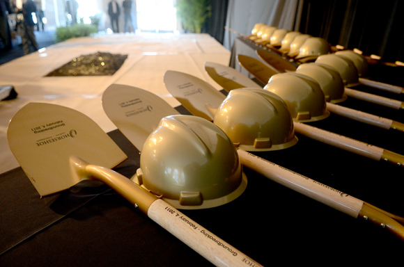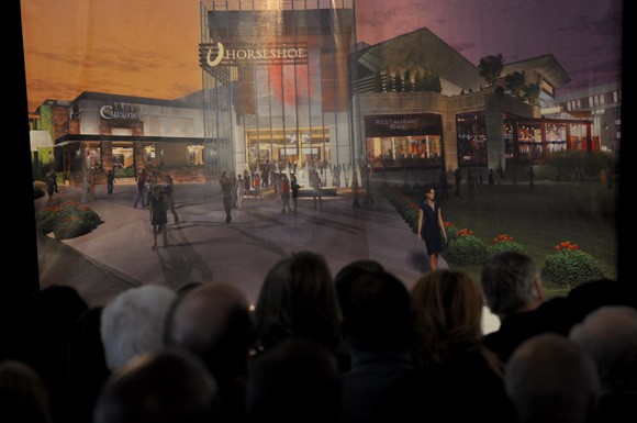 Friday morning, amidst a healthy dose of speechifying, dignitary recognition and gold dust-sprinkled soil tossing, the new casino at Broadway Commons officially broke ground. Dubbed “Horseshoe Casino – Cincinnati,” the $400 million gambling emporium is expected to the fill the vast and unsightly blight of a parking pit once known as Broadway Commons. Included in the impressive plans are 100,000 square feet of gaming, three “outwardly facing” restaurants, the always-requisite buffet smorgasbord (America!), a food court, a coffee shop and a main floor “feature bar.” With a crowd of 165 or so local politicos, celebrities and dignitaries in attendance, the flesh-pressing at the entrance threatened to create a human log jam of epic proportions. Fortunately, Rock Gaming President and COO Matt Cullen was able to herd the peripatetic politicos to their seats, in the process reciting a laundry list of those in attendance for singular, ego-stroking recognition (as each individually stood and received a perfunctory dollop of applause). One glaring omission by Cullen, however, was Hamilton County Sheriff Simon Leis, who then jumped up to tell Cullen (jokingly, we hope) that he just made his “biggest mistake yet.”