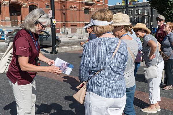 Barbara Gomes came to the program more recently, tagging along with her husband Ron Hoffman, a retired professor from Northern Kentucky University, who Toussaint recruited. Gomes, a Bostonian by birth but a Cincinnatian for nearly 50 years, was a history major in college and loved research. She worked closely with Tjepkema to refine several tours, especially Beyond the Bricks, which is stuffed with intriguing architectural and historical details about the building and the neighborhood. They created laminated notecards for guides to use that ensure consistent basic facts. That content has also been assembled as a PowerPoint presentation for volunteers to use in 60-minute engagements at clubs, retirement communities and libraries.