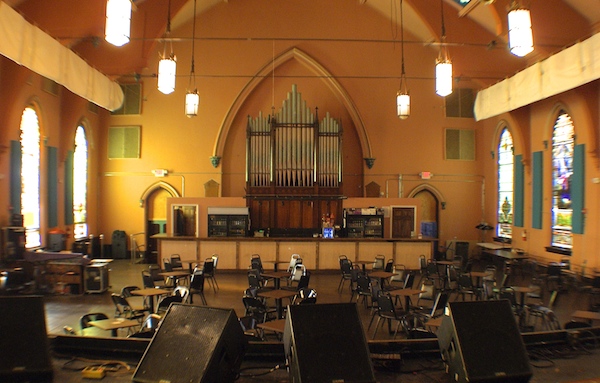 The Raleighs installed new flooring and an energy-efficient heating and cooling system. In the Sanctuary (space for as many as 500 people) they built a stage in the south end; the choir loft above as adapted into an open green room for musicians. The first-floor Lounge, with bar service, offers free small performances. Upstairs is the “Revival Room” seating 150, with a small stage probably once used for Sunday School programs.